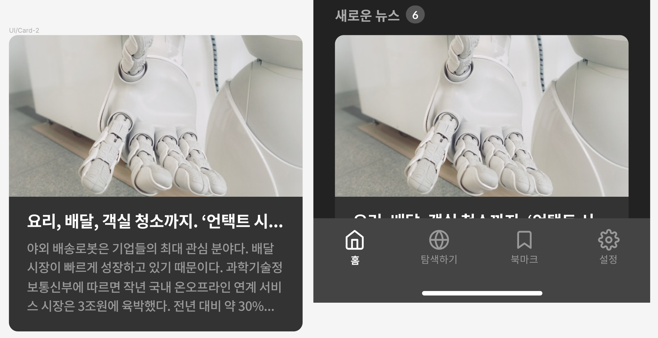 뉴스 카드에는 기사의 주제를 나타내는 아이콘과 기사 제목, 기사 본문의 일부가 박스 형태에 담긴다. 뉴스 카드 상단에 주제 아이콘 배치함으로써 뉴스의 주제를 한눈에 파악 / 뉴스마다 아이콘이 들어갈 것이므로 컴포넌트로 관리한다. 그러면 다른 주제로 바뀔 때 아이콘을 교체하기가 한층 간편해질 것이다.
