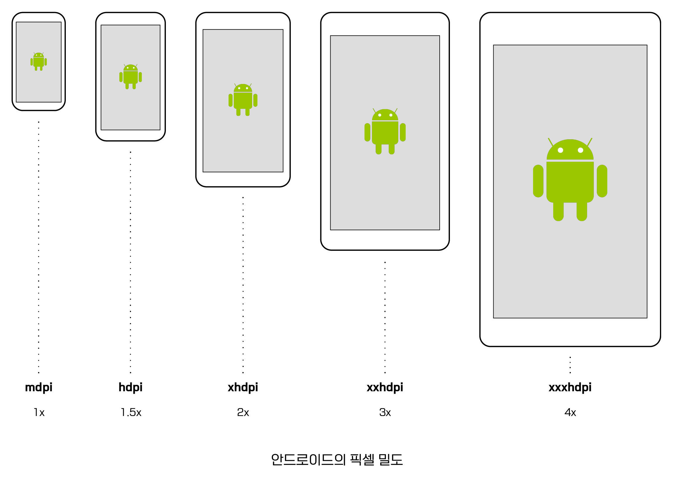 픽셀 밀도도 해상도만큼이나 다양하다. 안드로이드는 픽셀의 밀도를 일정 수로 분류했다. 대표적으로 mdpi, hdpi, xhdpi, xxhdpi, xxxhdpi가 있다. 여기사 mdpi(160dpi)는 1dp가 1px의 크기와 동일해 픽셀 비율이 1배이고, xxxhdpi는 그 기준의 4배이다. (이렇게 픽셀이 고밀도화될수록 화면은 더욱 선명하게 보임)