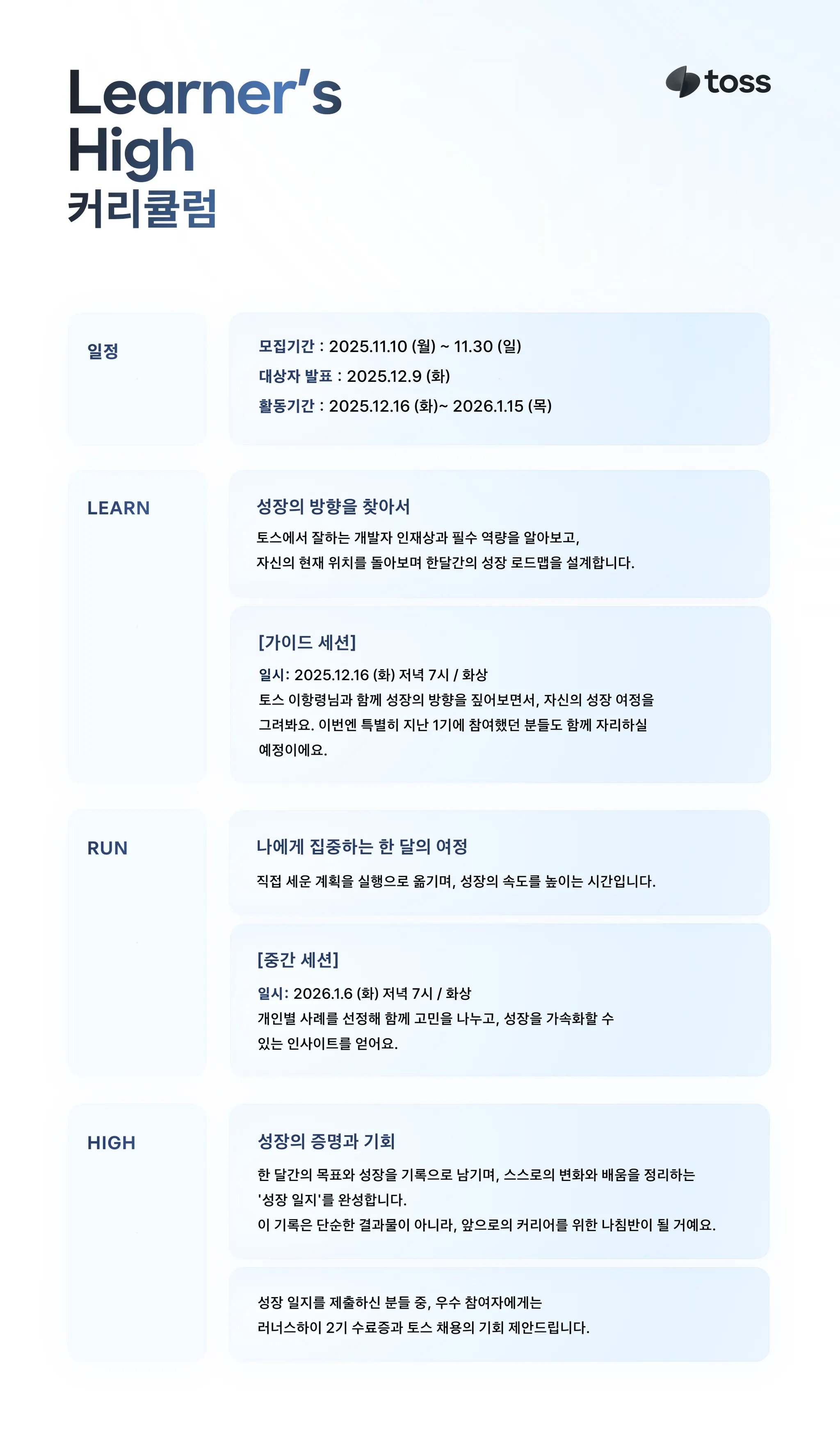 토스 Learner's High 1기 과정을 꼼꼼히 서칭해 보면서 참여해야겠다는 마음을 먹었었다. 커리큘럼은 아래와 같다.