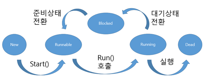 상태 Enum 설명 객체 생성 상태 New 스레드 객체 생성, start() 호출 전 실행 대기 Runnable 실행 상태로 언제든지 갈 수 있는 상태 일시정지 WAITING 다른 쓰레드가 통지(notify) 할 때까지 기다리는 상태 일시정지 TIMED_WAITING 주어진 시간 동안 기다리는 상태 일시정지 BLOCKED 사용하고자 하는 객체의 Lock이 풀릴 때까지 기다리는 상태 종료 TERMINATED 쓰레드의 작업이 종료된 상태