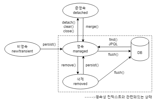 위에서 볼 수 있듯이 영속성 컨텍스트와 관련 있는 영속, 삭제 상태는 플러시를 거쳐 데이터베이스와 동기화가 되는 대상이다.