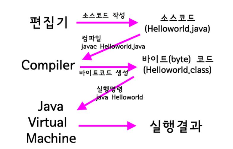 💡 자바의 java, 컴파일된 파일을 실행할 수 있는 런처(lanuncher)를 이용하여 실행하여야 한다.