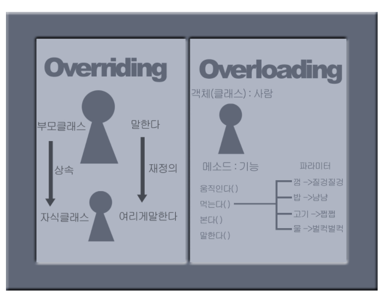 💡 상속과 연관되는 개념으로 한 객체가 다른 여러 형태(객체)로 재구성 되는 것을 의미 ex) 한 부모의 밑에서 태어난 자식이 똑같지 않는 것과 같은 것이 있다.