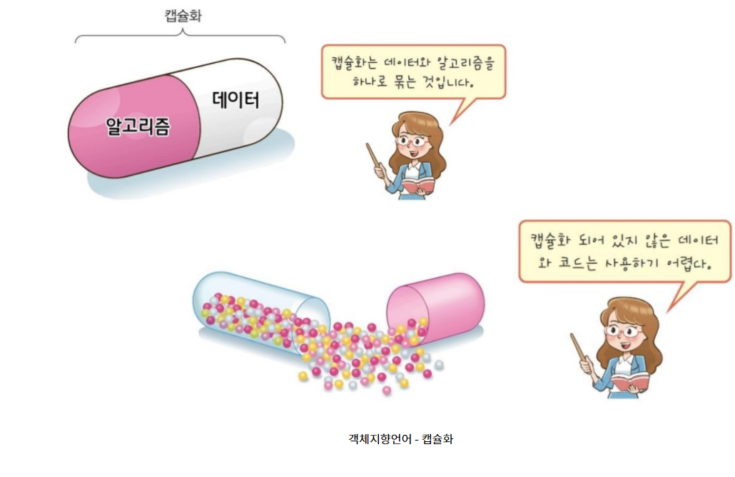 💡 데이터와 코드의 형태를 외부로부터 알 수 없게 하고, 데이터의 구조와 역할, 기능을 하나의 캡슐 형태로 만드는 방법
