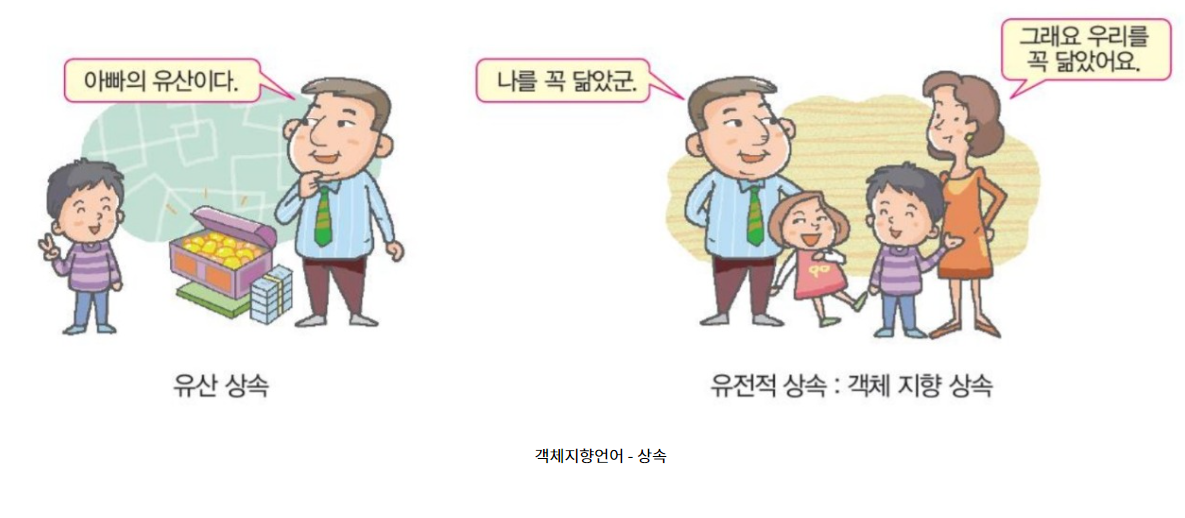 ex) 부모가 자식에게 유전자를 물려주듯이 부모의 특징을 자식이 모두 물려받게 된다.