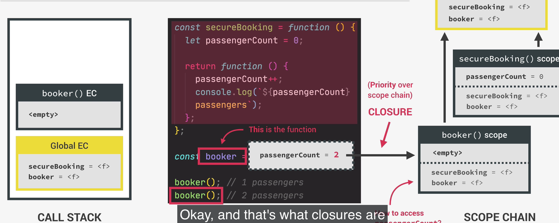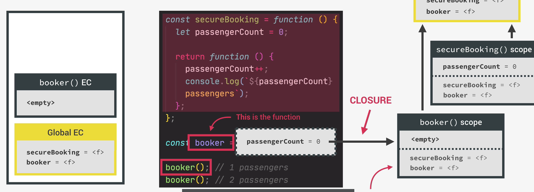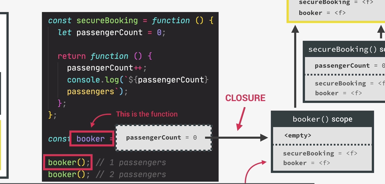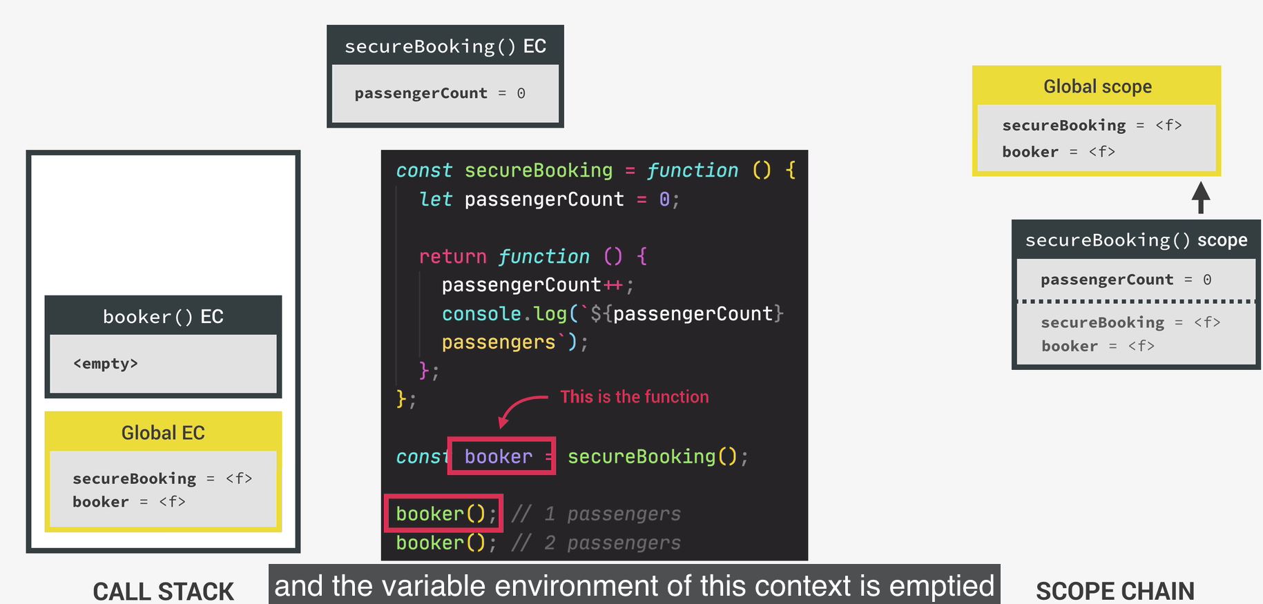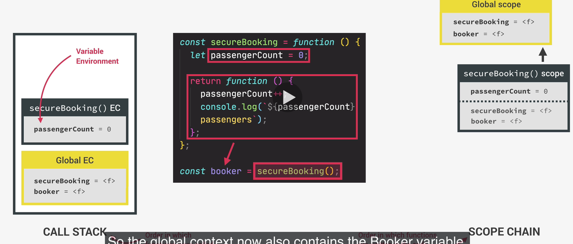 So, therefore the Booker function will get access to this variable environment, which contains the passengerCount variable.