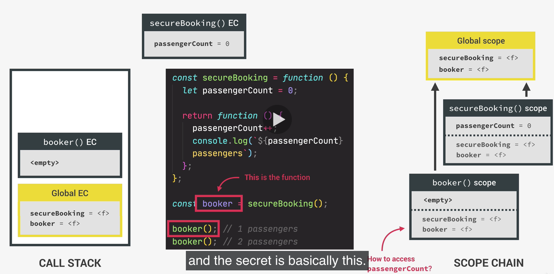 but still this inner function here, which is the Booker function, is still able to access the passengerCount variable that's inside of the Booker function that should no longer exist.