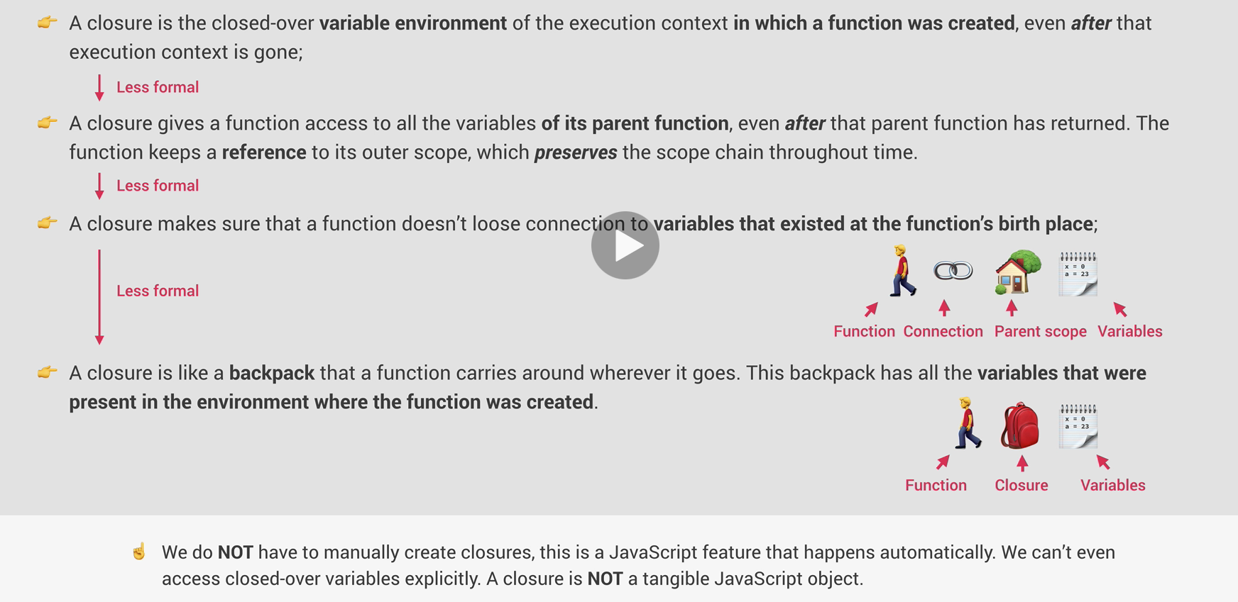 The closure is then basically this variable environment attached to the function,exactly as it was at the time and place that the function was created.