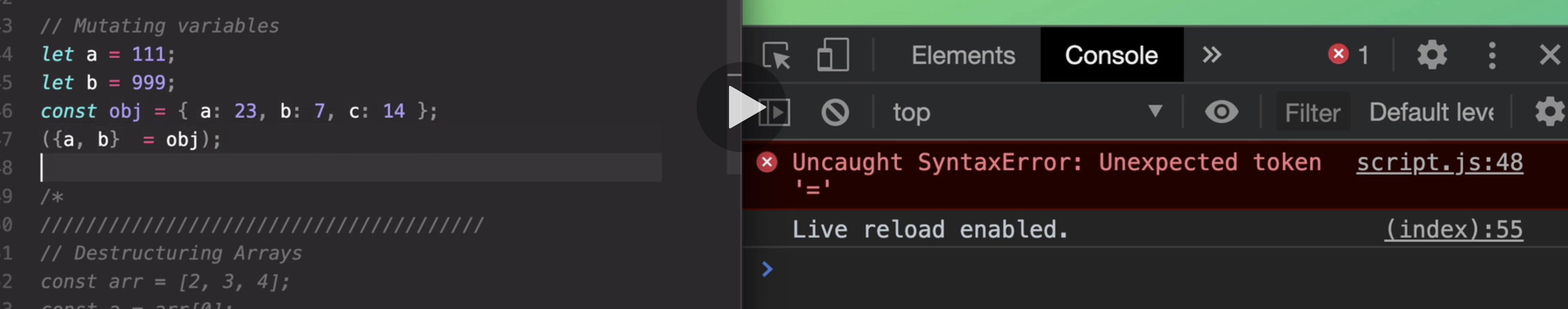 then we get this error, unexpected token with the equal there.
