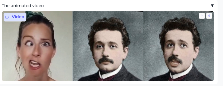 정적인 사진에 동적인 비디오를 업로드하면 얼굴 모션을 따라하고, 립싱크하는 다이내믹한 사진으로 바꿔주는 모델이다. (아래 예시: 왼쪽 여성은 비디오, 중앙 정적 사진, 오른쪽 결과물: 정적인 사진이 여성의 표정을 따라함.)