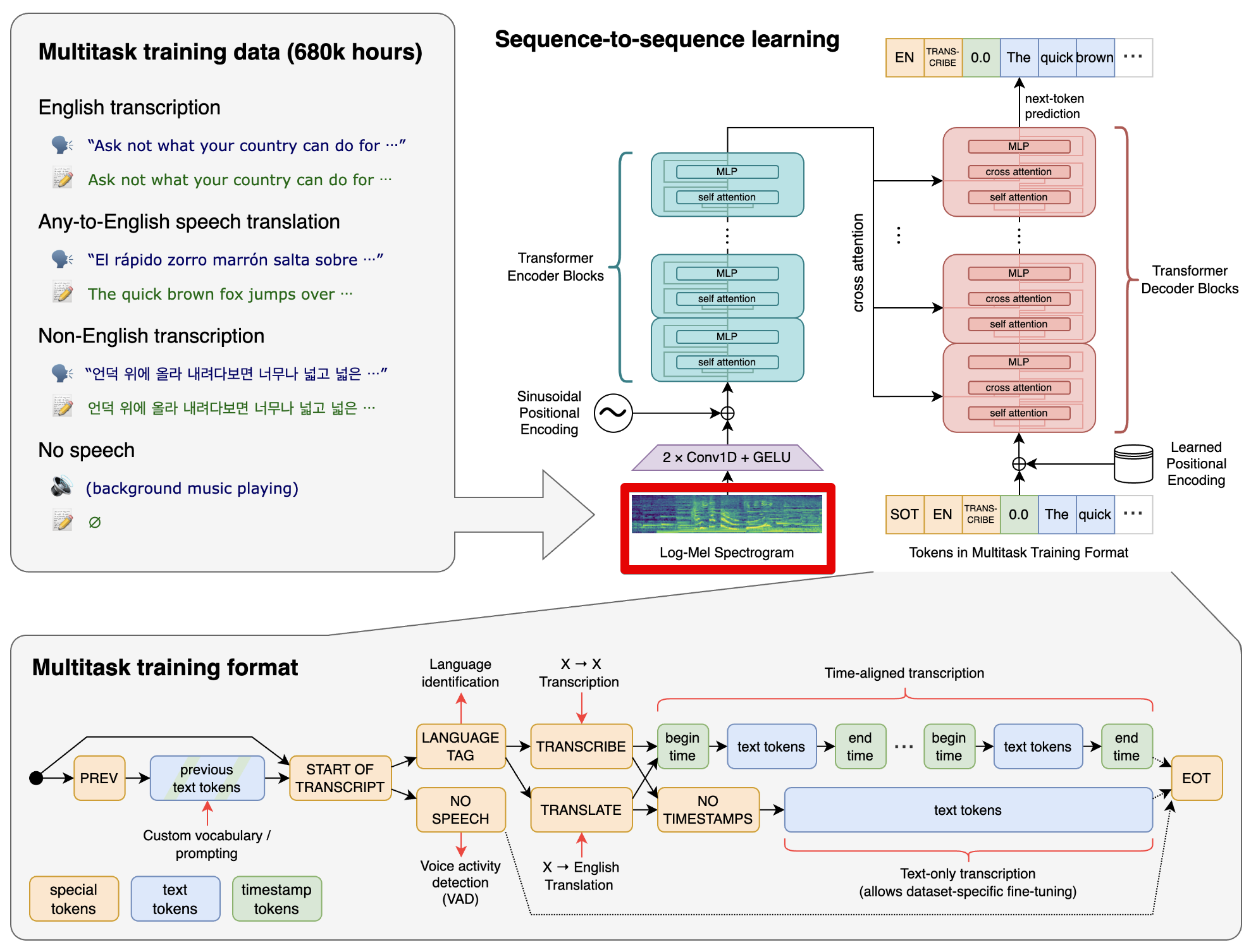 Speech to text는 오디오 데이터를 30초 분량을 하나의 chunk 단위로 입력받으면 인코더와 디코더를 지나 하나의 토큰을 생성하고, 이 과정을 무수히 많이 반복하는 로직을 갖는다.