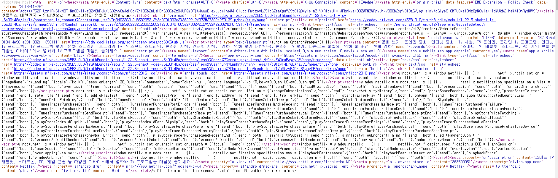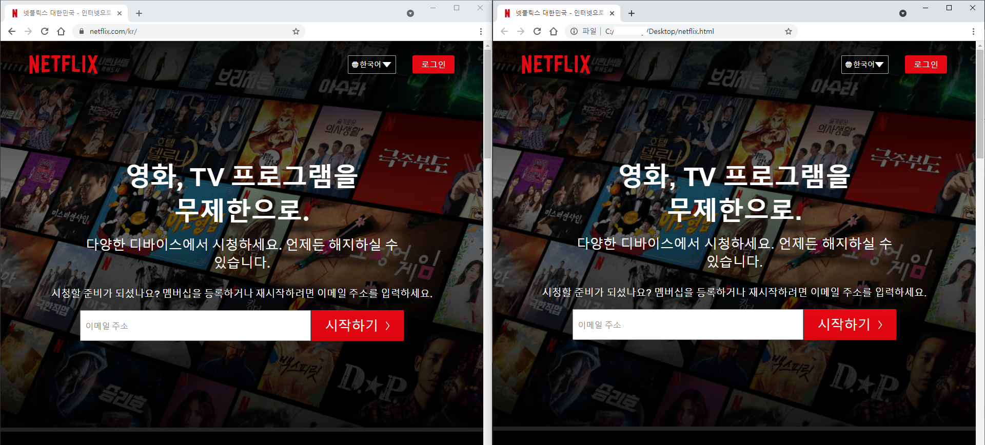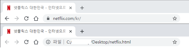 위에는 넷플릭스 공인 사이트 접속 주소이며 아래는 방금 만든 HTML로컬 접속 주소이다.