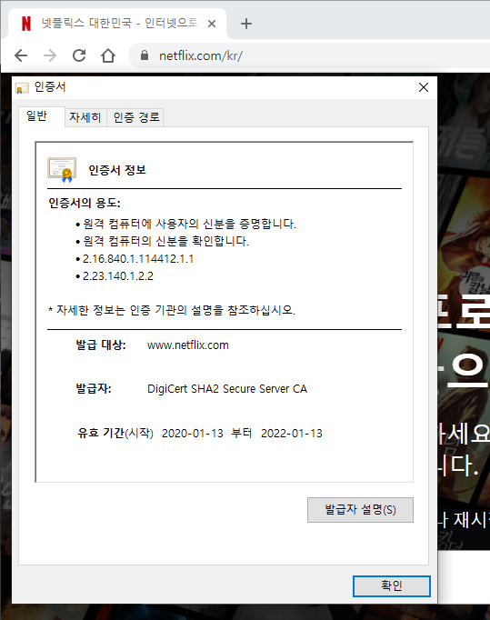 브라우저에 표시되는 자물쇠 아이콘을 클릭하여 인증서 정보를 확인하여 공인된 인증서 접속인지 확인해보면 더 좋다.