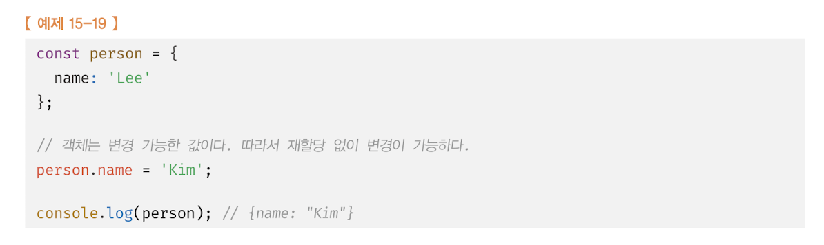 변경 가능한 값인 객체는 재할당 없이도 직접 변경이 가능하기 때문이다.
