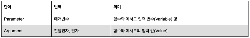 parameter(매개변수)는 함수 혹은 메서드 정의에서 나열되는 변수명이다.