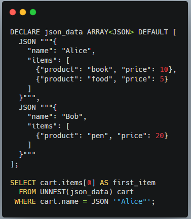 WHERE JSON_VALUE(cart.name) = "Alice";