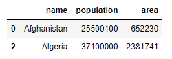 world = pd.DataFrame(data, columns=['name', 'continent', 'area', 'population', 'gdp']).astype({'name':'object', 'continent':'object', 'area':'Int64', 'population':'Int64', 'gdp':'Int64'})
