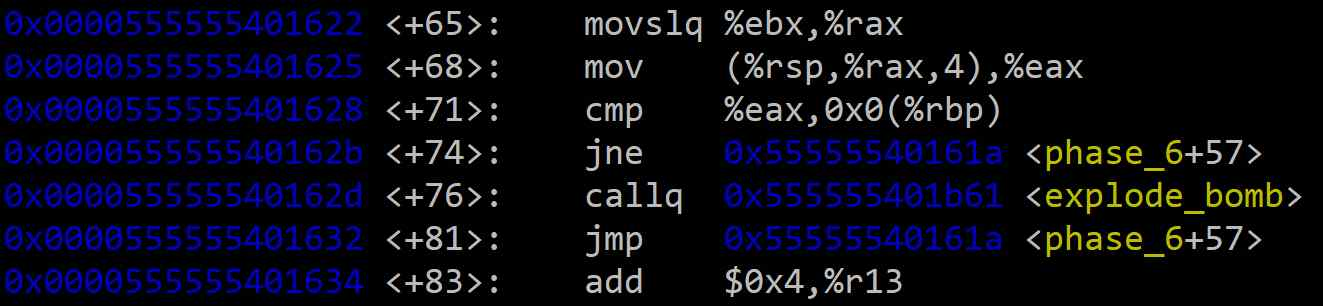 <+65> ~ <+68>: 안쪽 루프의 카운터 %ebx를 이용해 비교할 다른 숫자의 값((%rsp + %rax*4))을 가져온다.<+71> ~ <+76>: (조건 2: 중복 검사) 바깥쪽 루프에서 선택된 숫자(%rbp)와 안쪽 루프에서 선택된 다른 숫자가 같은지 비교한다. 만약 두 값이 같다면(jne가 실행되지 않으면) 중복된 것이므로 폭탄이 터진다.<+57> ~ <+63>: 안쪽 루프의 카운터 %ebx를 1 증가시키고, 모든 비교를 마쳤는지 확인한다.<+83> %r13 += 4