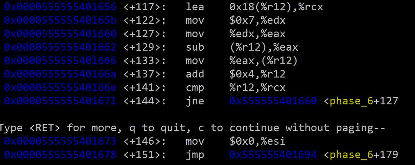 <+117> lea 0x18(%r12),%rcx: %rcx에 루프의 종료 지점(마지막 입력 정수의 다음 주소)을 저장한다.<+122> mov $0x7,%edx: 변환에 사용할 상수 7을 %edx에 저장한다.이 루프는 %r12 포인터를 이용해 6개의 입력값을 순회하며 다음 연산을 수행한다.