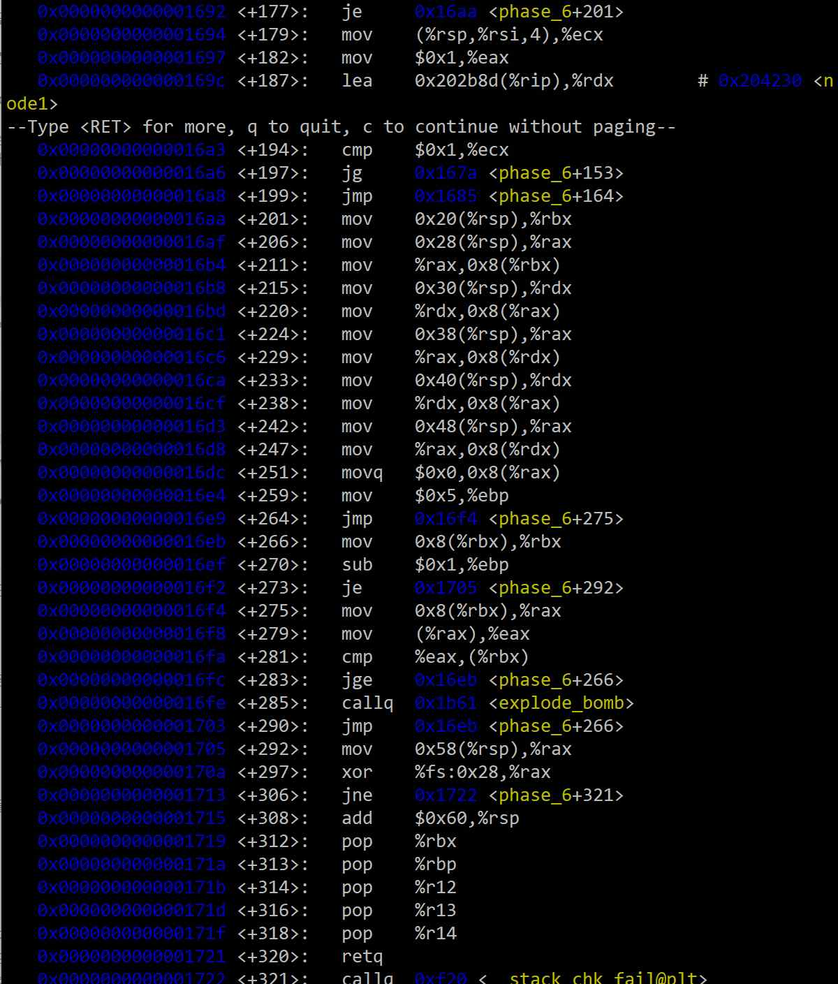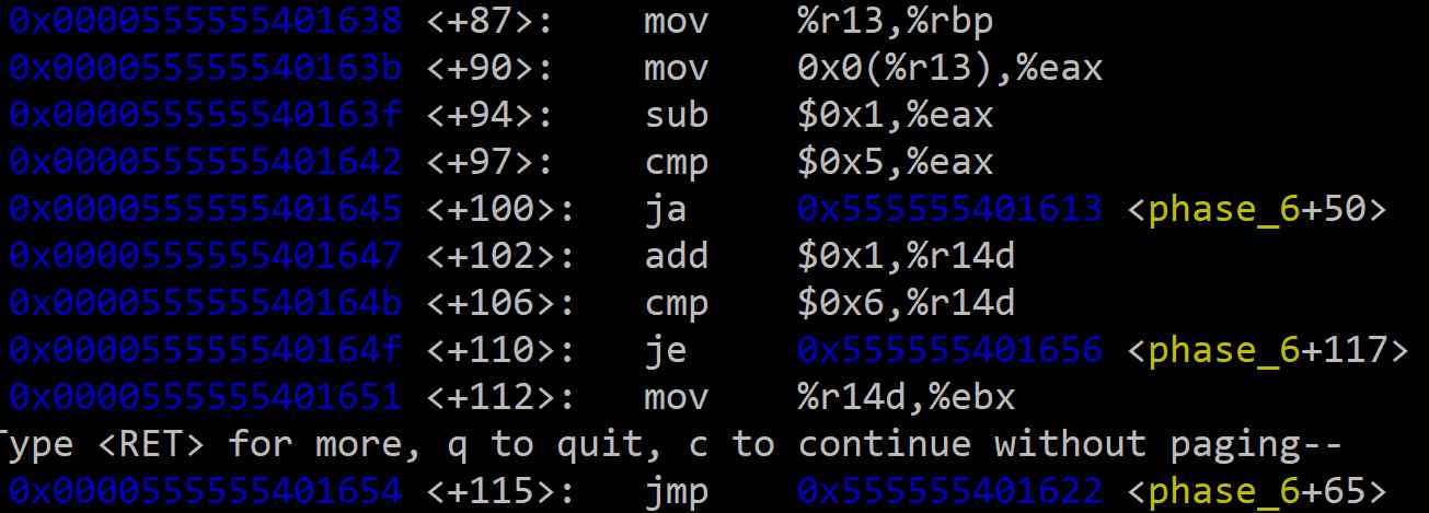 <+87> mov %r13, %rbp: 현재 검사할 숫자의 주소(%r13에 저장된 값, 초기 루프 진입 기준 %rsp에 저장된 값)를 %rbp에 저장한다.<+90> ~ <+100>: (조건 1: 범위 검사) 현재 검사 중인 숫자((%r13))가 1에서 6 사이의 값인지 확인한다. 만약 (값 - 1)이 5보다 크면(ja 명령어), 즉 값이 1~6 범위를 벗어나면 폭탄이 터진다.<+102> ~ <+110>: 바깥쪽 루프의 카운터 %r14d를 1 증가시키고, 6개의 숫자를 모두 검사했는지 확인한다.<+115> jmp <phase_6+65>: 안쪽 루프로 진입한다.안쪽 루프는 바깥쪽 루프에서 선택된 하나의 숫자가 배열 내 다른 숫자들과 중복되는지 검사한다.