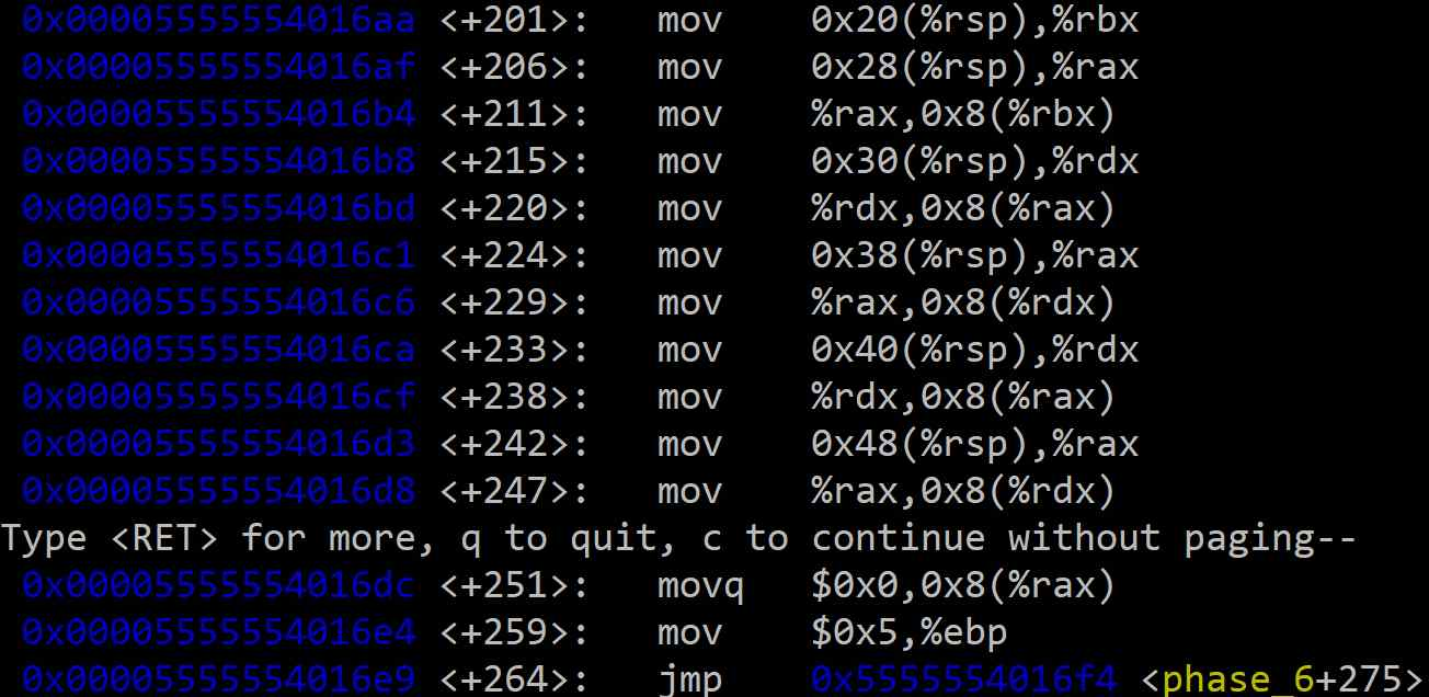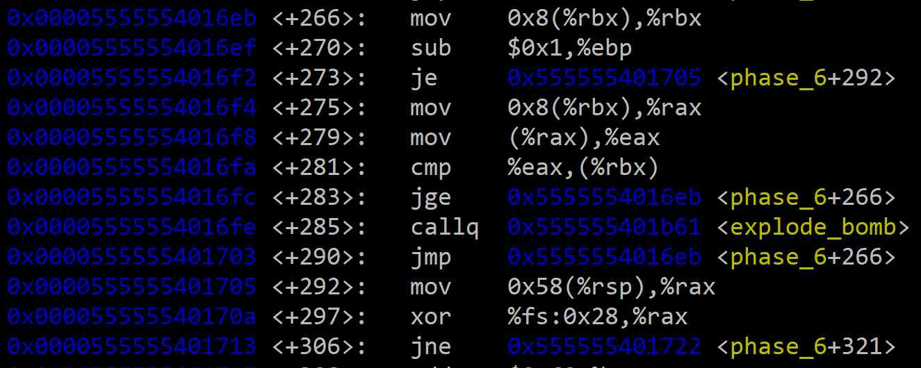 <+275>: 현재 노드(%rbx)의 next 포인터 값을 %rax에 저장한다. 즉, %rax는 다음 노드의 주소를 가리킨다.<+279>: 다음 노드의 주소(%rax)에 저장된 값을 %eax로 가져온다.<+281>: 현재 노드의 값((%rbx))과 다음 노드의 값(%eax)을 비교한다.<+283>: 비교 결과, 현재 노드의 값이 다음 노드의 값보다 크거나 같으면(jge: Jump if Greater or Equal) 루프의 다음 단계로 안전하게 분기한다. 만약 현재 노드의 값이 더 작으면 폭탄이 터진다.즉, 바로 재배열된 연결 리스트가 노드의 값을 기준으로 내림차순으로 정렬되어 있어야 한다.