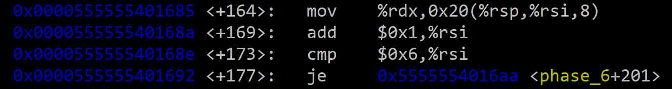 <+173>/<+177> if %rsi == 6 then goto <+201>