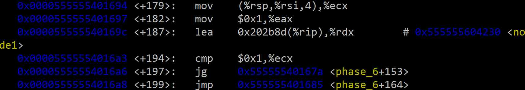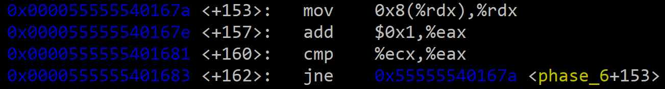 0x0 ~ 0x3 (4바이트): 노드가 가진 고유의 값0x4 ~ 0x7 (4바이트): 노드의 인덱스 (1~6)0x8 ~ 0xf (8바이트): 다음 노드를 가리키는 포인터<+194> ~ <+197>: 변환된 값이 1보다 큰지 확인한다.<node1>을 찾아야 하므로 이미 %rdx에 올바른 주소가 있다. 따라서 중첩 루프(구간 B)를 건너뛰고 바로 저장 단계(구간 C)로 간다.n번째 노드를 찾기 위해 중첩 루프(구간 B)로 진입한다.<+153> ~ <+162> 구간은 중첩 루프에 해당한다. 변환된 값이 1보다 클 때만 실행되며, 연결 리스트의 시작(<node1>)부터 next 포인터를 따라가며 목표한 <node_n>을 찾는 역할을 한다.