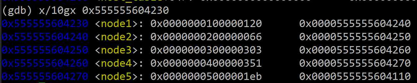 <+179>: 현재 순서(%rsi)에 해당하는 변환된 값을 %ecx에 가져온다.<+187>: 포인터 %rdx를 연결 리스트의 시작인 <node1>의 주소로 초기화한다. GDB를 이용해 이 주소부터 메모리를 분석하면, 각 노드가 다음과 같은 규칙적인 구조를 가짐을 알 수 있다.