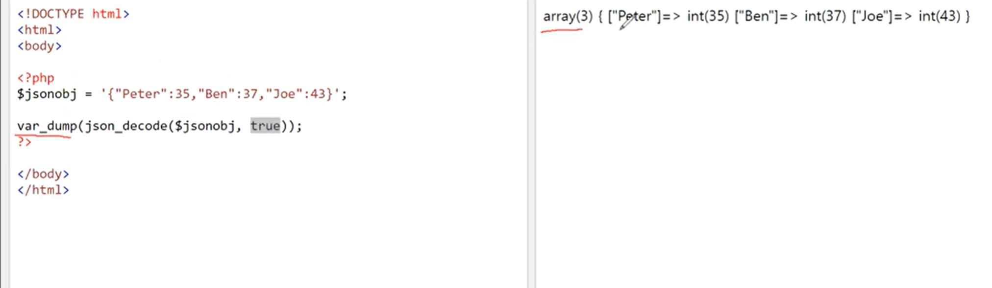 (json값, true/false) -> false가 기본값. php의 객체 형태로 변환. trueaus associate array로 변환된다.