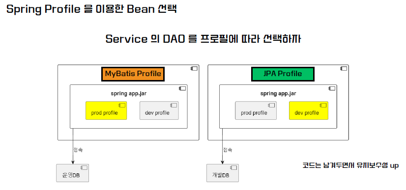 저희는 이 중 Bean 을 선택해 등록하는 기능에 집중하였고, 결국 JPA profile, MyBatis profile 을 분리해 사용되는 DAO 를 구별하였습니다.