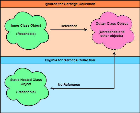 반면 Static Nested Class 의 경우 Outer Class 객체의 참조를 가지고 있지 않다. 따라서 Inner Class 의 경우와 다르게 GC 의 수거대상에 올라간다.