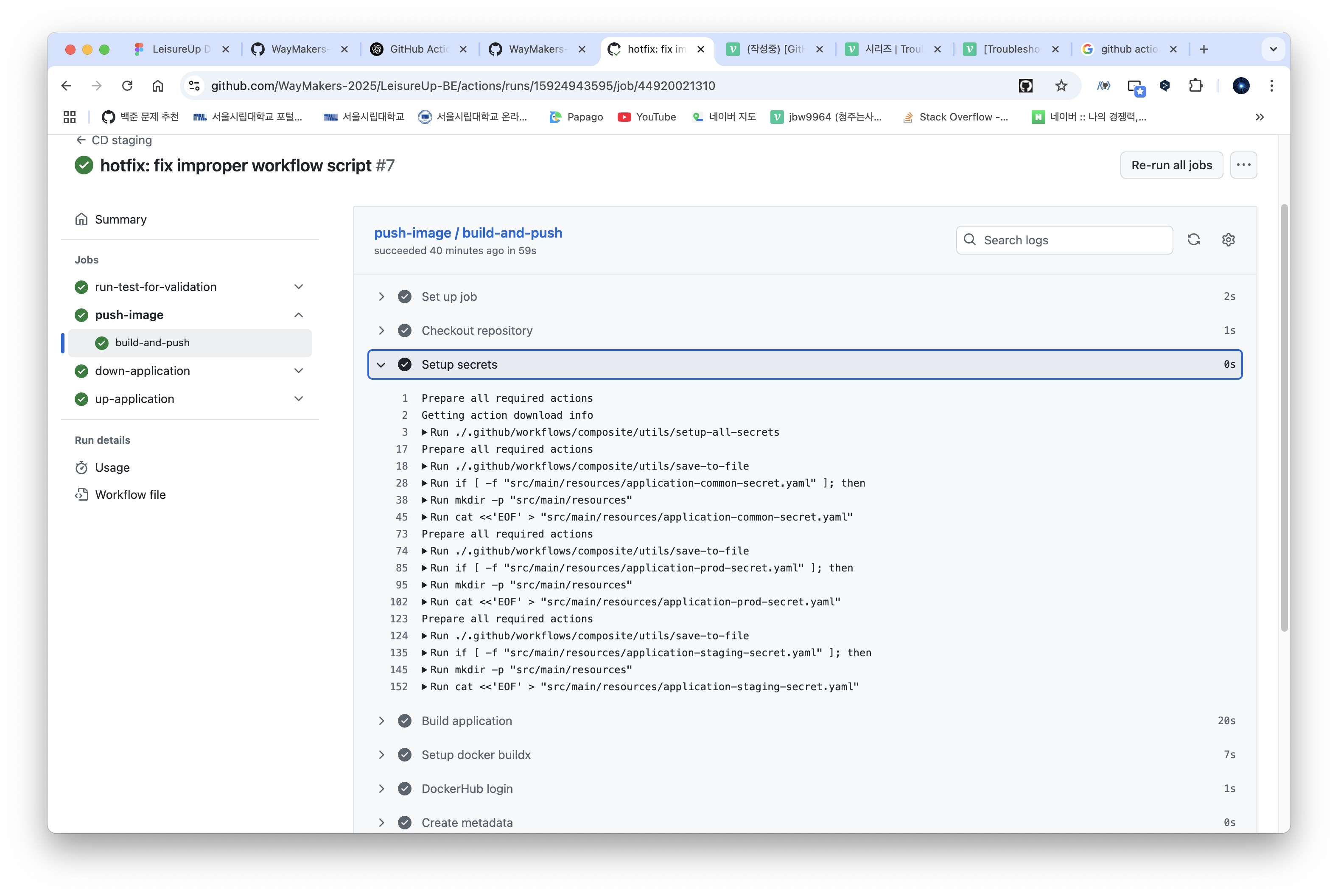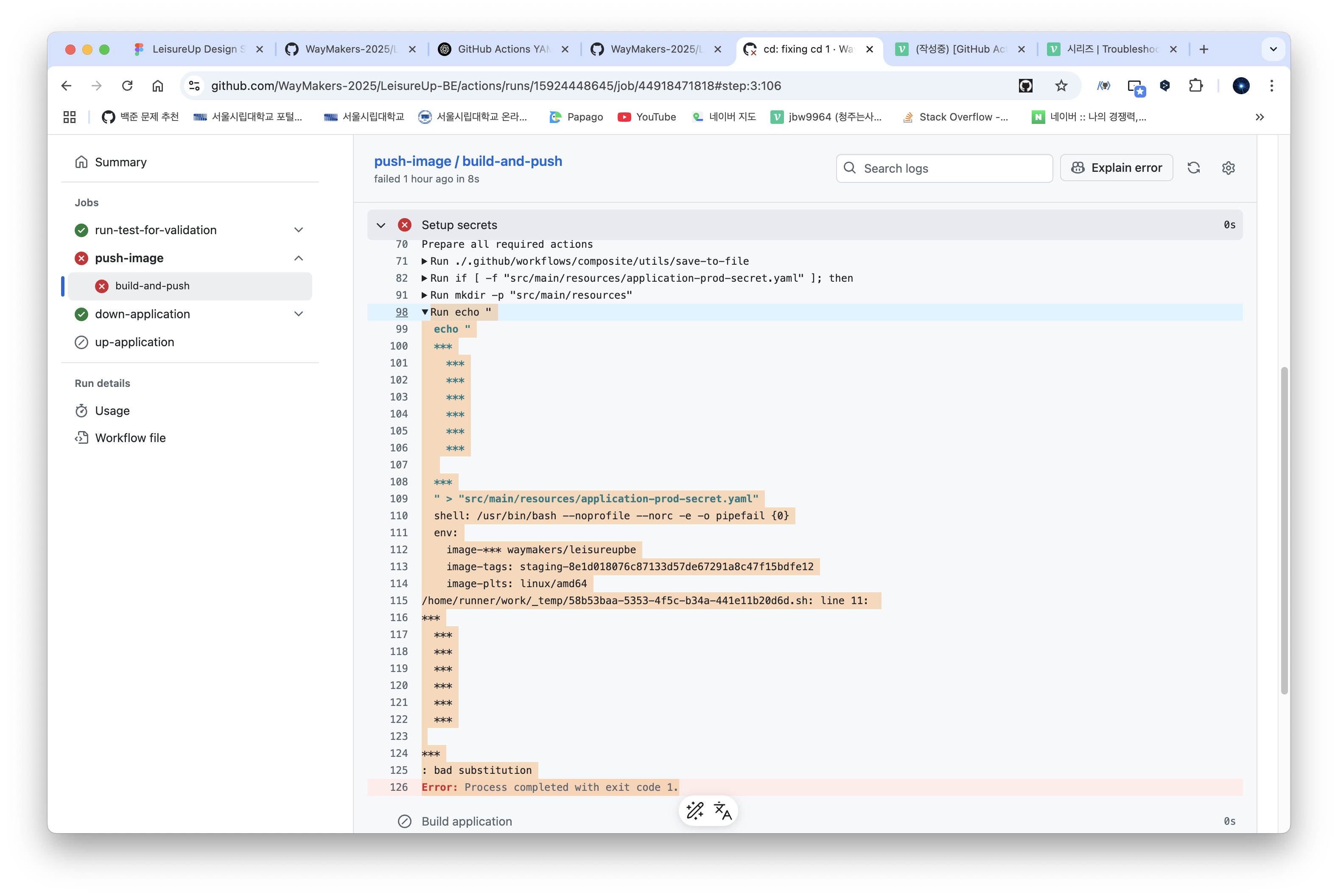 는 어플리케이션을 build, 생성된 이미지를 Docker Hub 에 업로드하는 과정으로, 여러 "비밀 처리된" 프로필을 넣어주는 과정이 포함되어 있습니다.