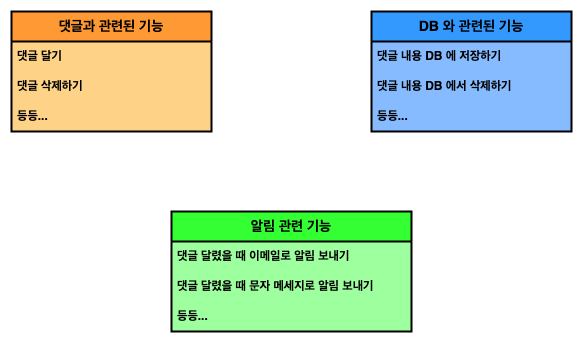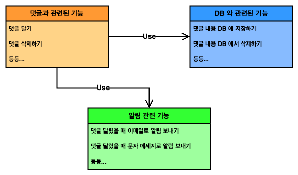 또한 생각해보면 우리는 "댓글이 달렸을 때 DB 에 내용을 저장하고, 사용자에게 알림을 주고 싶으므로" 아래와 같은 의존관계를 생각할 수 있다.