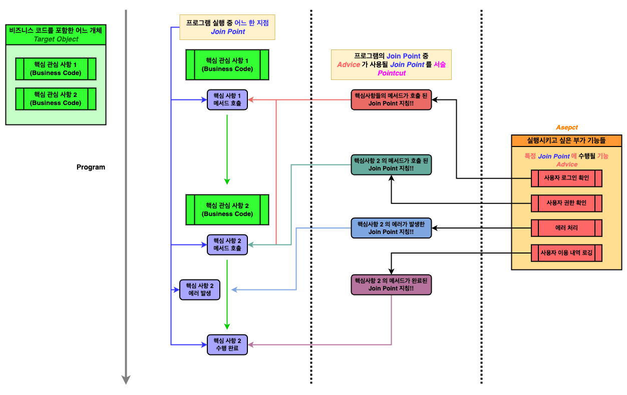 이처럼 주요 관심 사항 (Core Concerns) 에 다른 관심 사항을 교차시켜 공통된 관심사항 (Cross-cutting Concerns) 으로 프로그래밍 하는 방식을 관점 지향 프로그래밍 (AOP, Aspect-Oriented Programming) 이라 부른다.