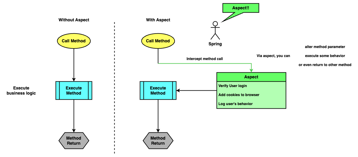 Aspect 로 메서드 호출 시점에 개입하여 특정 조건의 로그 남기기 같은 기능을 추가할 수 있고, 심지어 실행되는 메서드를 다른것으로 대체할 수도 있다.