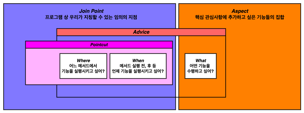 | Aspect | 핵심 관심사항에 부가적으로 적용시키고 싶은 로직들의 집합. (Modularization of a concern) |