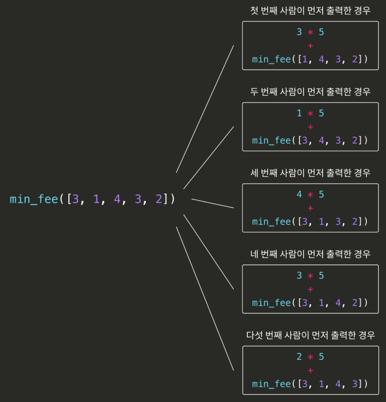 다섯 사람이 각각 출력해야 하는 페이지 수는 3장, 1장, 4장, 3장, 2장입니다. 프린터는 한 대밖에 없고, 1장을 출력하기 위해서는 1분이 걸린다.