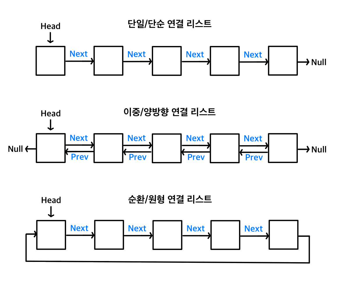 추상적 자료 구조인 단일 연결 리스트, 양방향(이중) 연결 리스트, 그리고 순환/원형 연결 리스트가 있다.