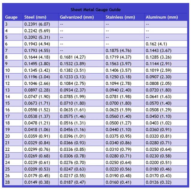 There are several sheet metal thickness charts and sheet metal gauge charts that convert sheet thickness from inches and millimeters into gauges.