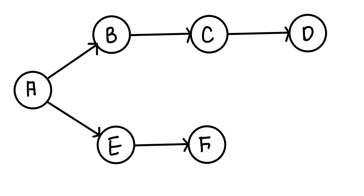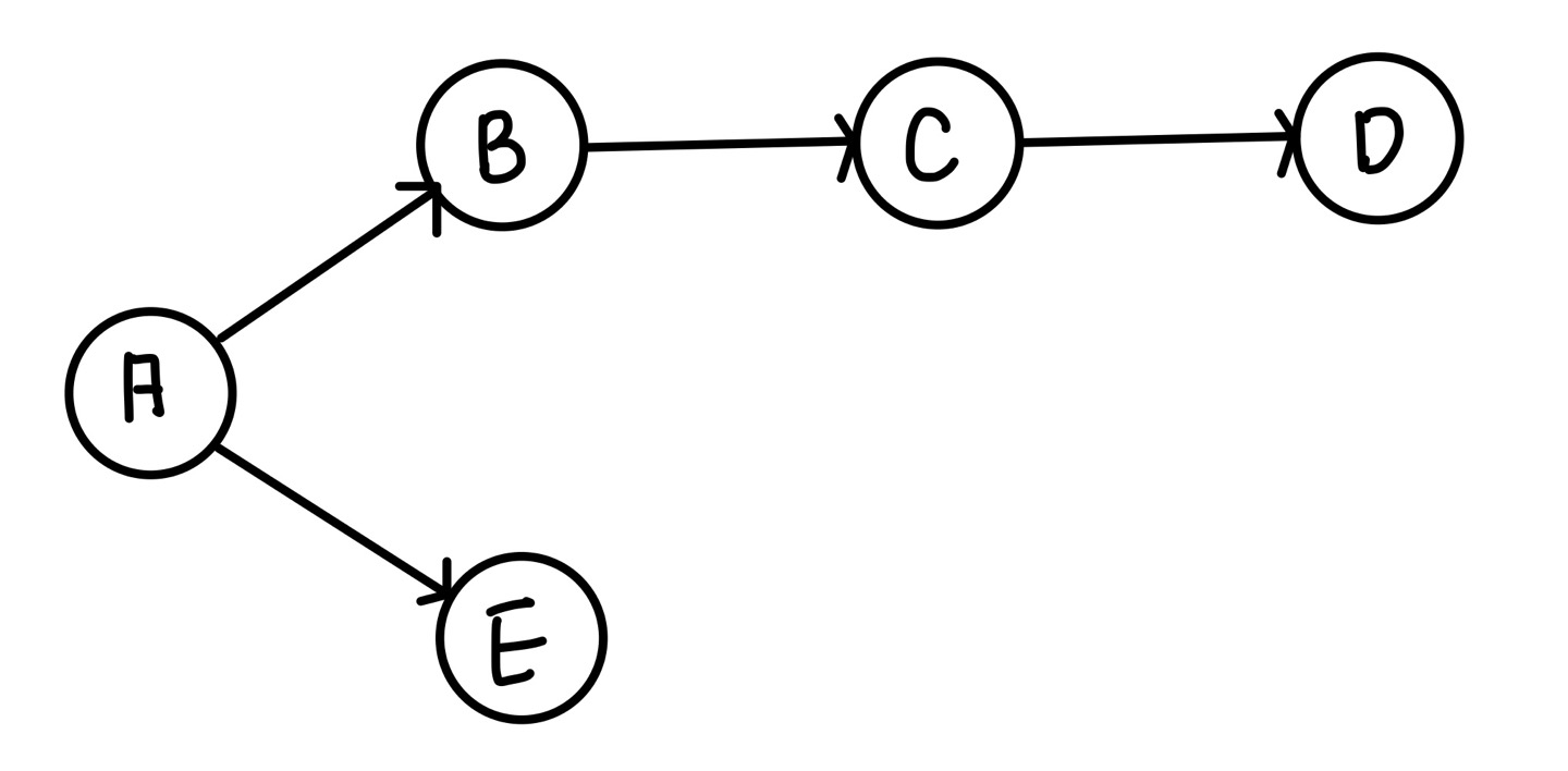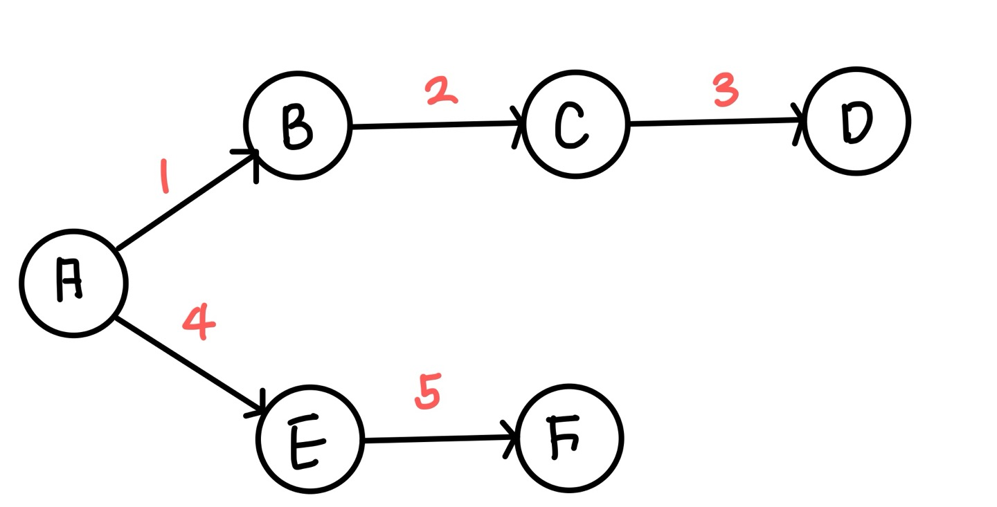처음 A노드에서 갈 수 있는 길은 B로 갈 수 있는 경로와 E로 갈 수 있는 경로로 나뉜다.