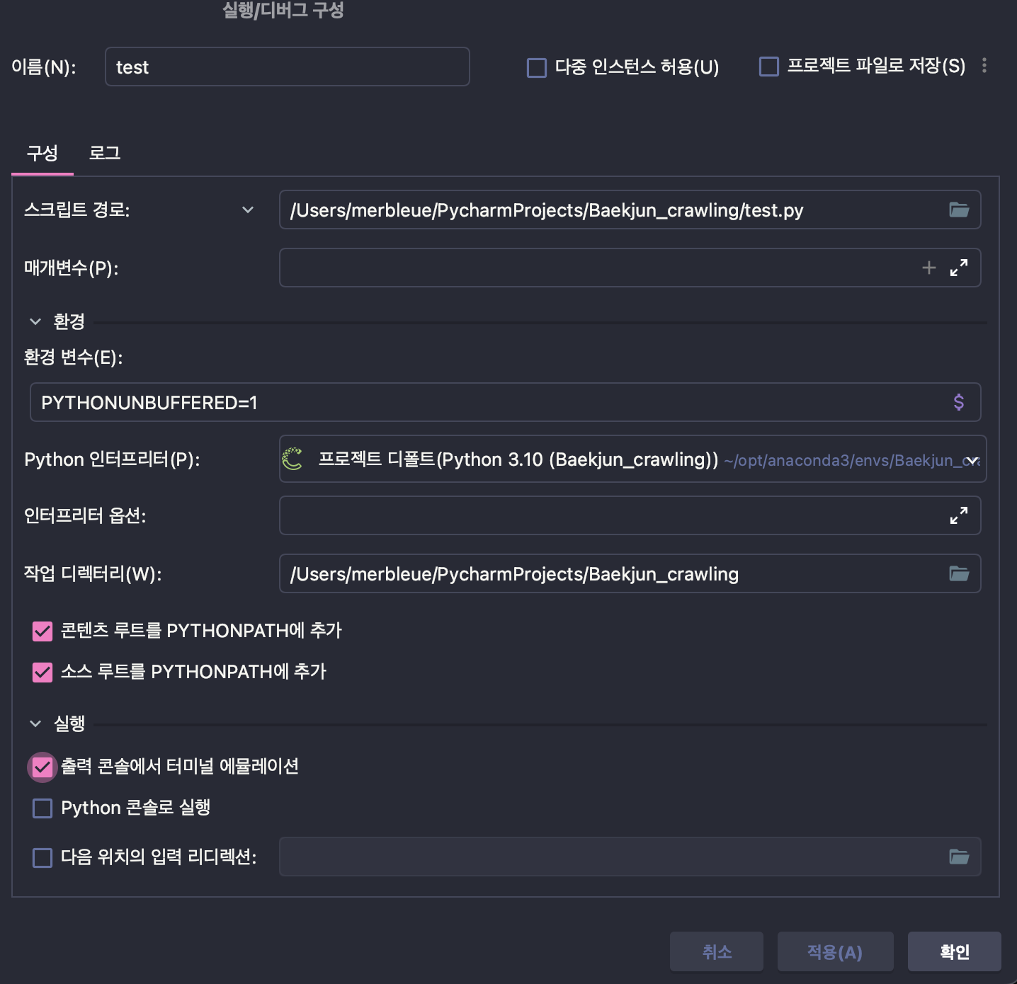 구성 편집을 누르면 해당 UI가 나온다. 밑에 하단의 "출력 콘솔에서 터미널 에물레이션"을 체크한다!