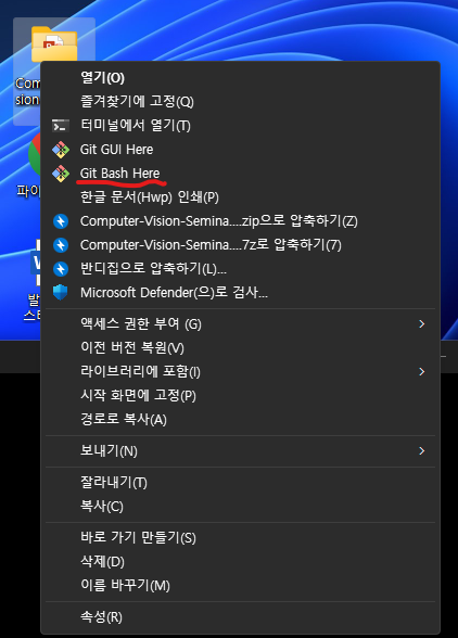 Git bash로 오픈하는 방법은 바탕화면에서 업로드 하려는 파일에 마우스 오른쪽 버튼을 클릭하면됩니다. Win 11의 경우 맨 밑 추가옵션표시를 누르면 나옵니다.