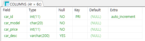 → AUTO_INCREMENT : 자동으로 증가하라는 말인데, 위에서는 자동으로 car_id의 값이 1부터 증가한다.