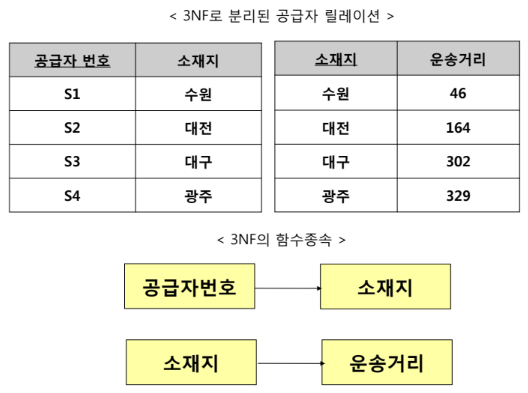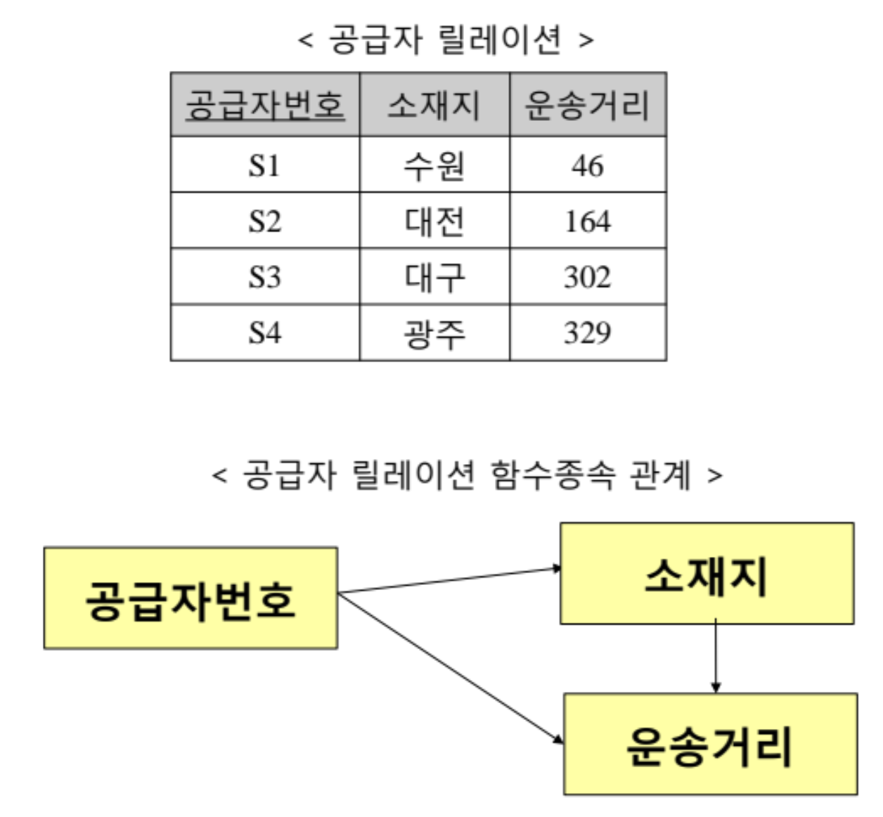 → 위 그림에서 공급자번호 -> 소재지, 소재지 -> 운송거리 이므로 공급자번호 -> 운송거리가 된다.