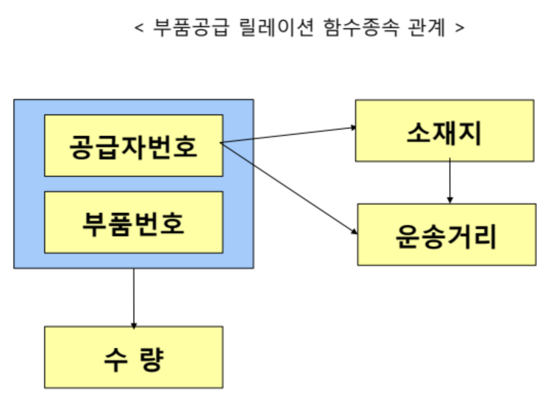그리고 수량은 공급자번호와 부품번호 모두에 종속적이고(어떤 공급자가 어떤 부품을 보내느냐에 따라 결정되기 때문) 이를 완전 함수 종속이라고 한다.