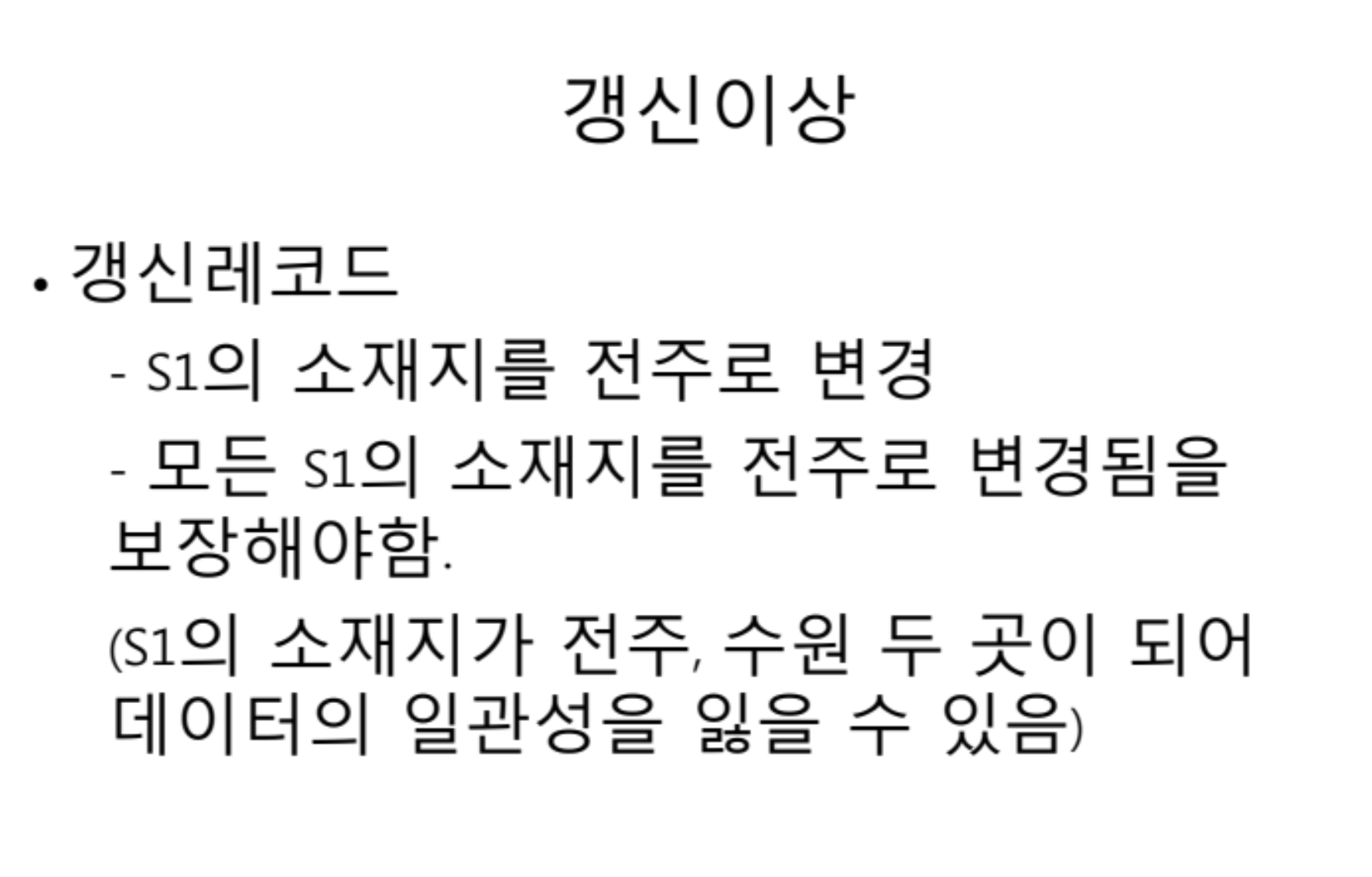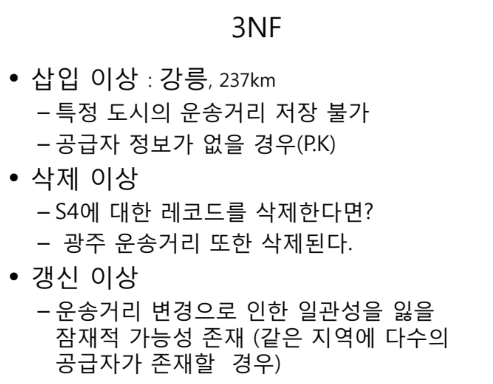 갱신 이상 : 예를 들어 같은 수원에 여러 공급자가 존재할 때, 일부 운송거리만 변경되면 일관성을 잃게 되는 문제가 발생한다.