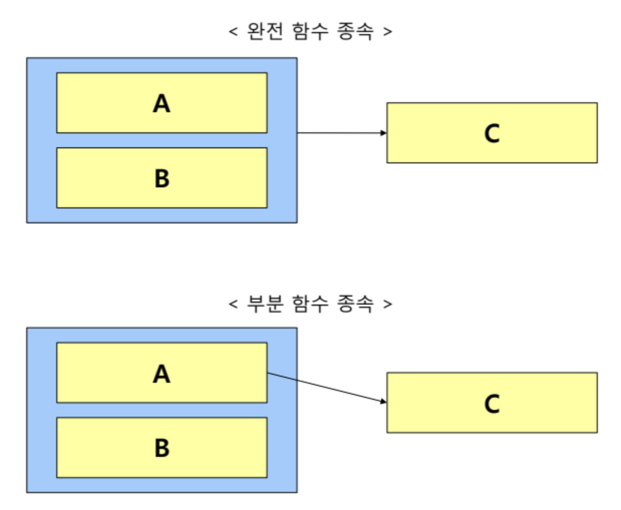 → 완전 함수 종속 : 복합키로 구성하고 있는 모든 열에 의해 종속된 것