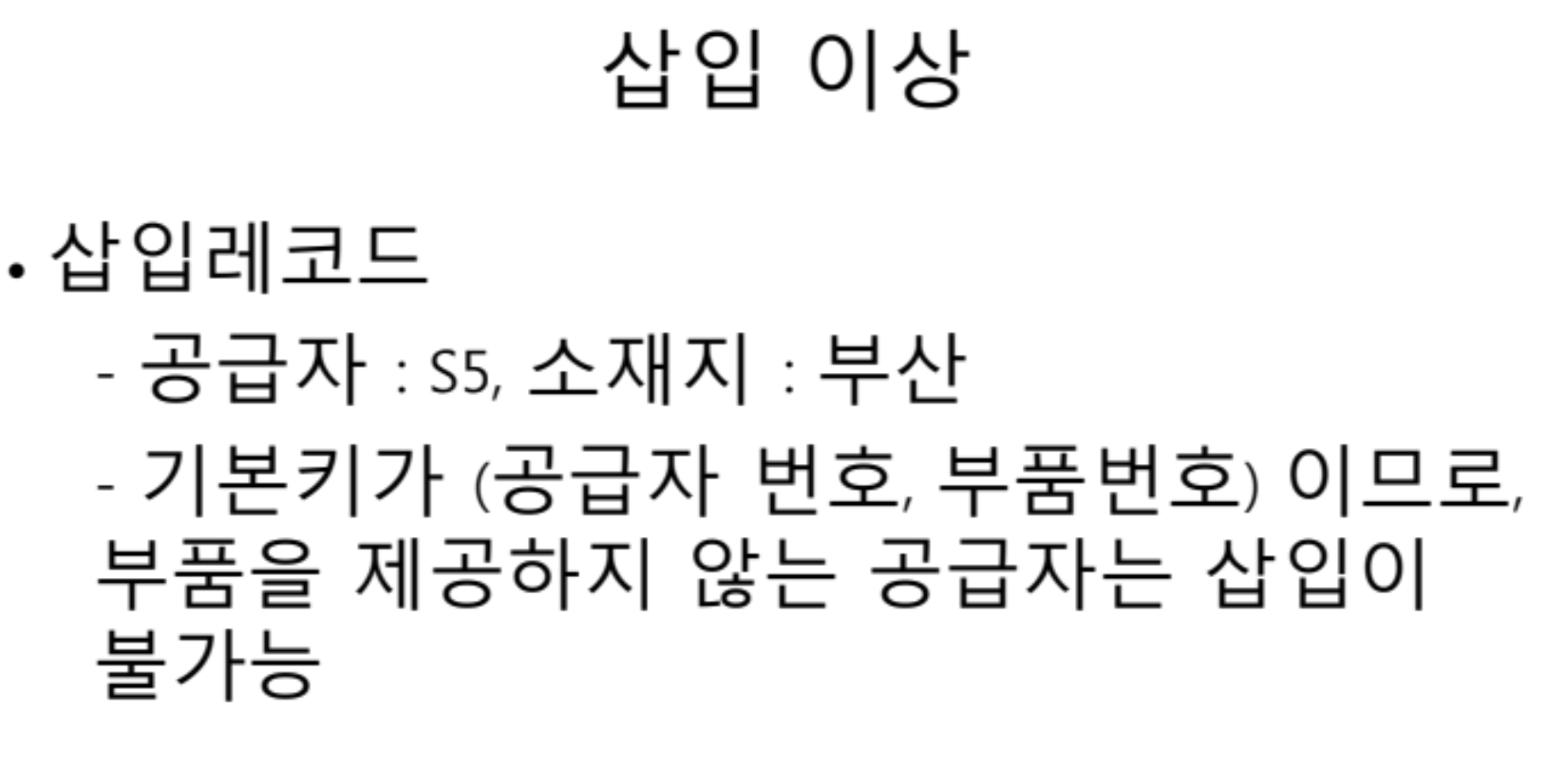 삽입할 레코드에 공급자와 소재지만 존재하고 복합키 중 다른 하나인 부품번호는 들어 있지 않다. 삽입할 정보가 부족하기에 발생하는 문제점이다.