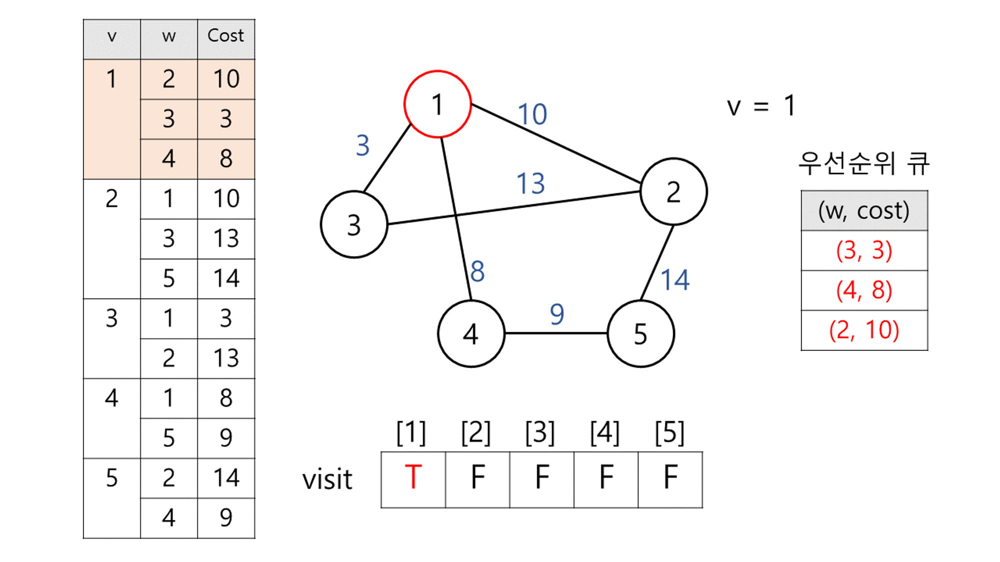 프림 알고리즘은 우선 순위 큐를 사용하여 최소 가중치 간선을 선택하고 연결된 정점을 관리한다. 시간 복잡도는 주로 우선 순위 큐 연산에 의해 결정된다.