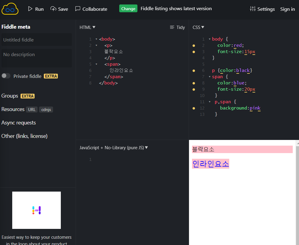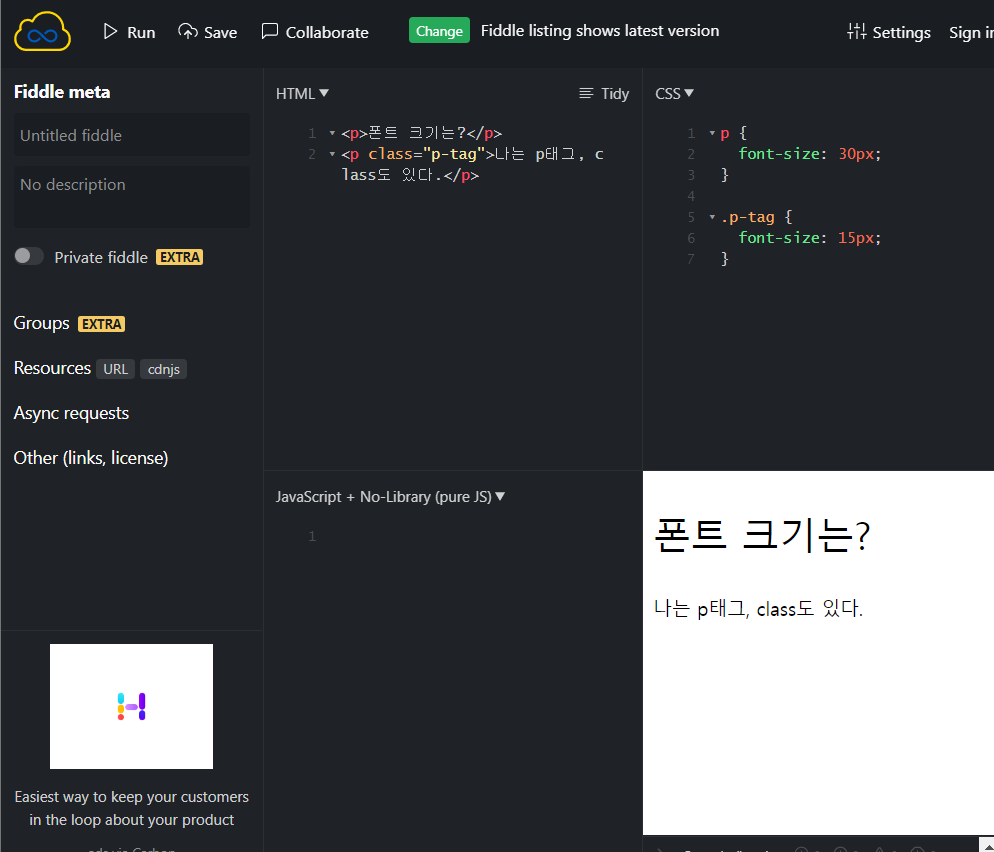- (ex. <p style=”font-size: 30px;”>inline styling으로 CSS 적용</p>)